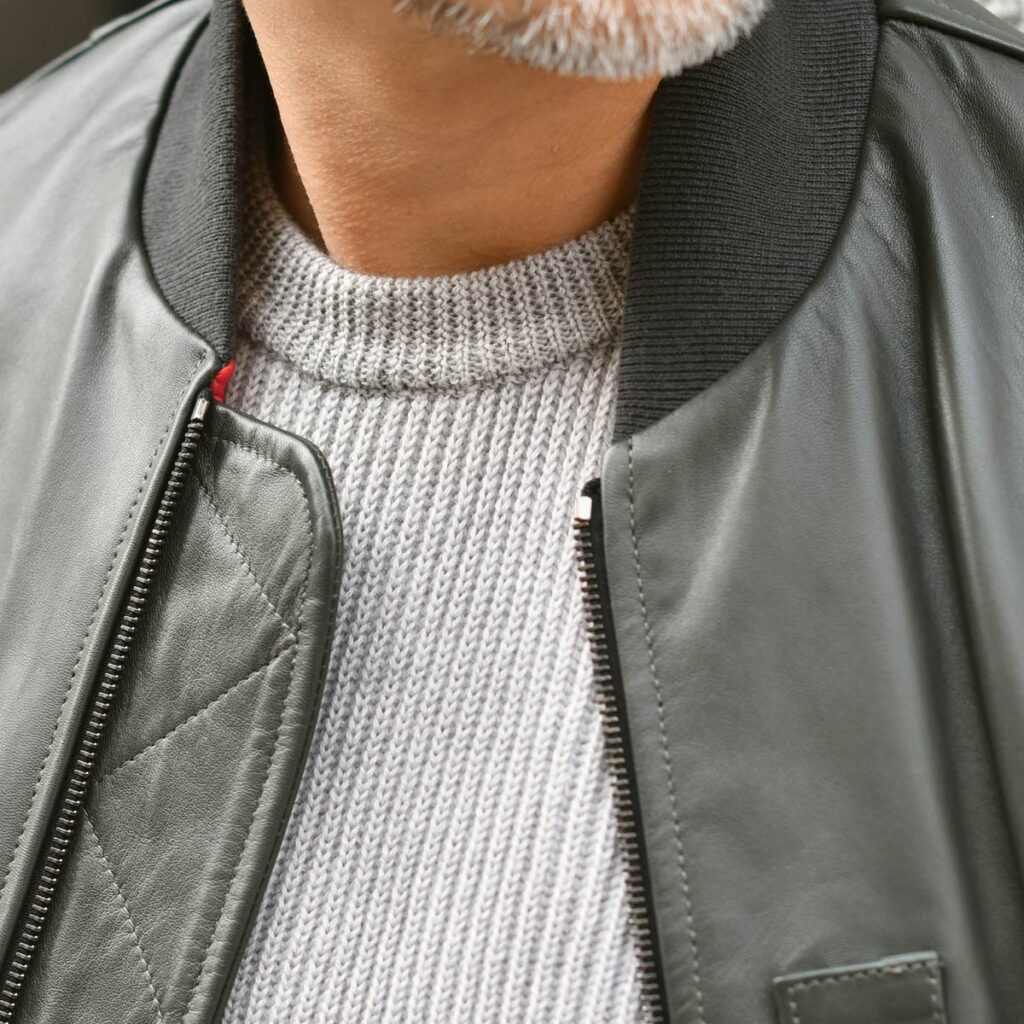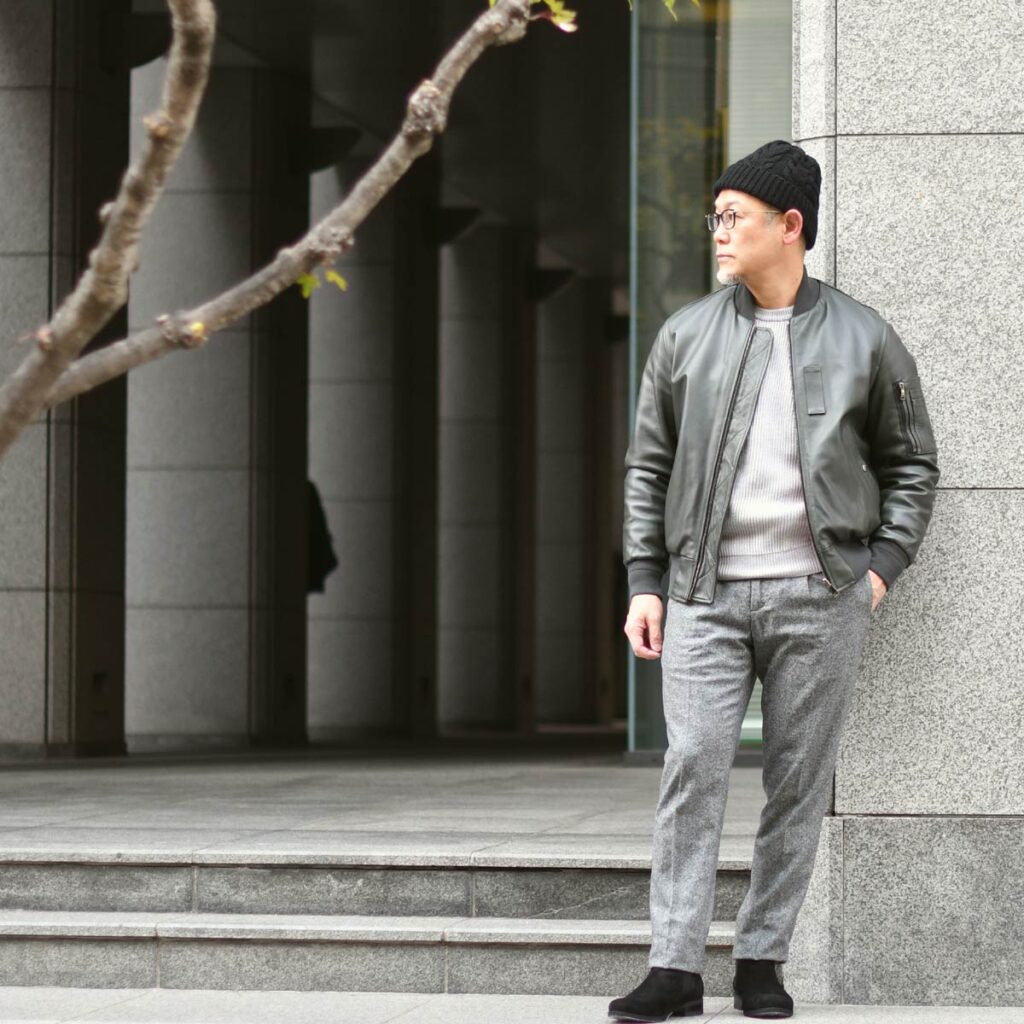 奥深いグリーンレザーのブルゾンにはミニマルな色合わせで