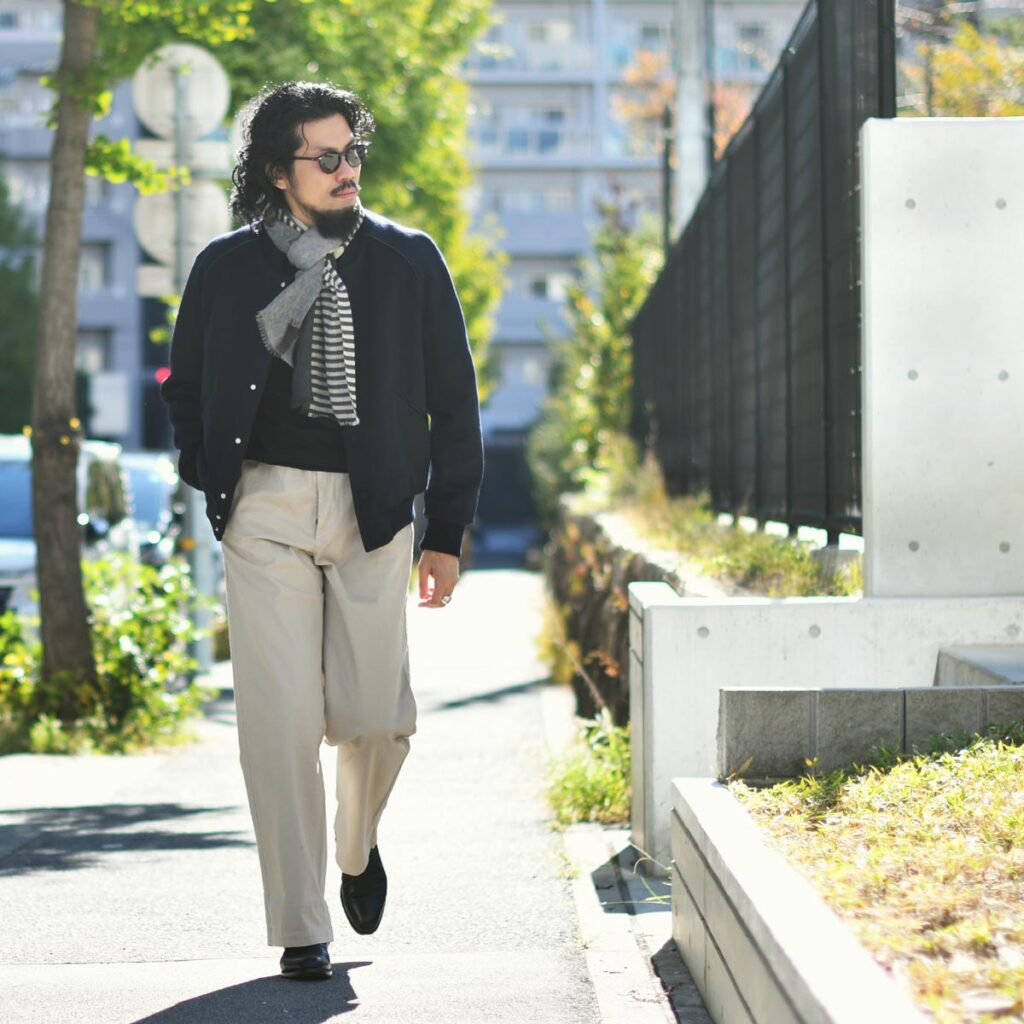 ゆとりあるストレートシルエットはショートブルゾンとも好相性。