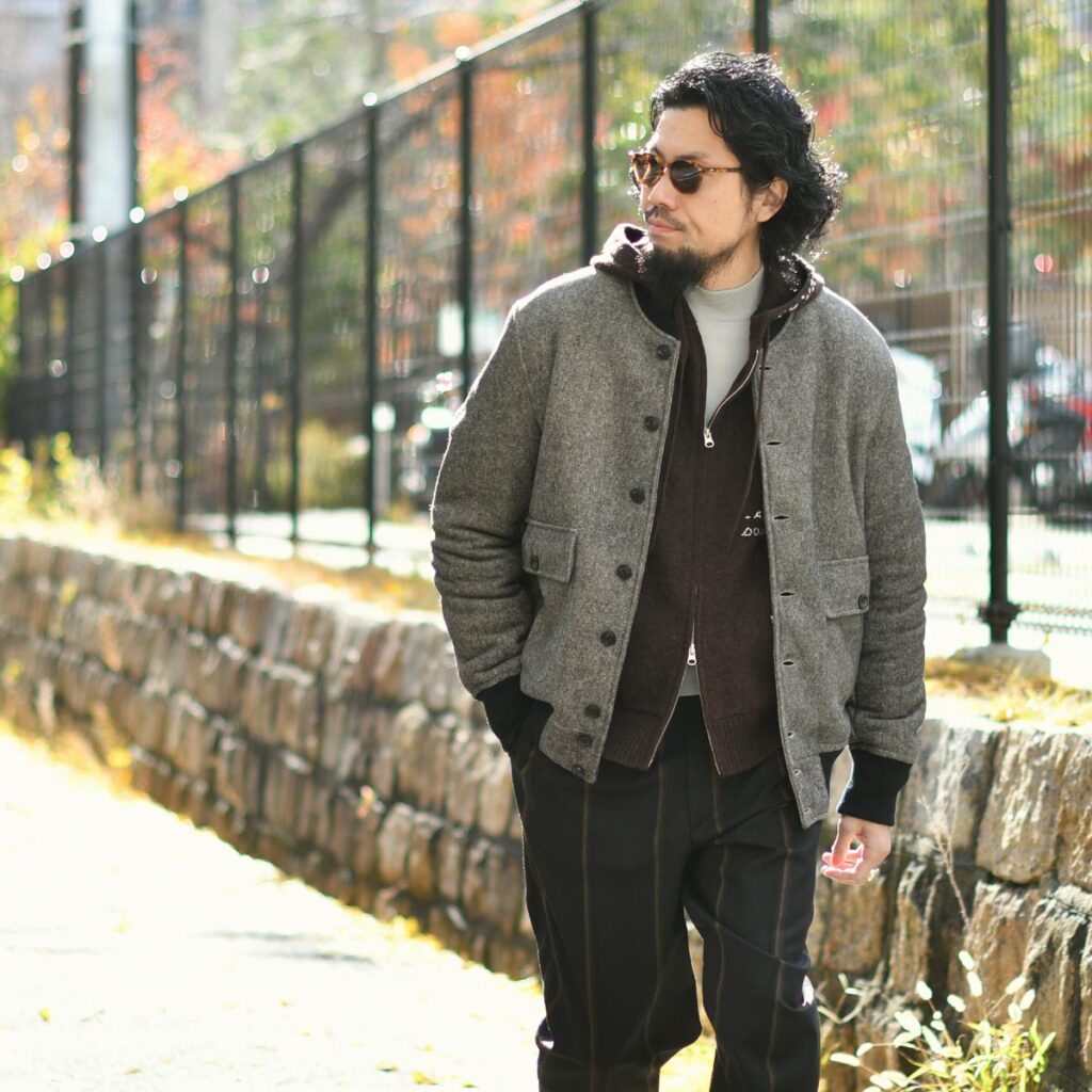 ヘリボーンプリントがウールのアウターを想起させる遊びの効いた1着。