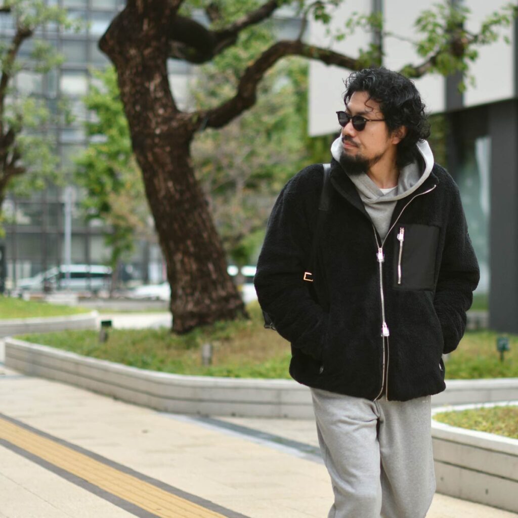 スウェットの上下でも部屋着っぽくは見えないスタイリッシュさ。